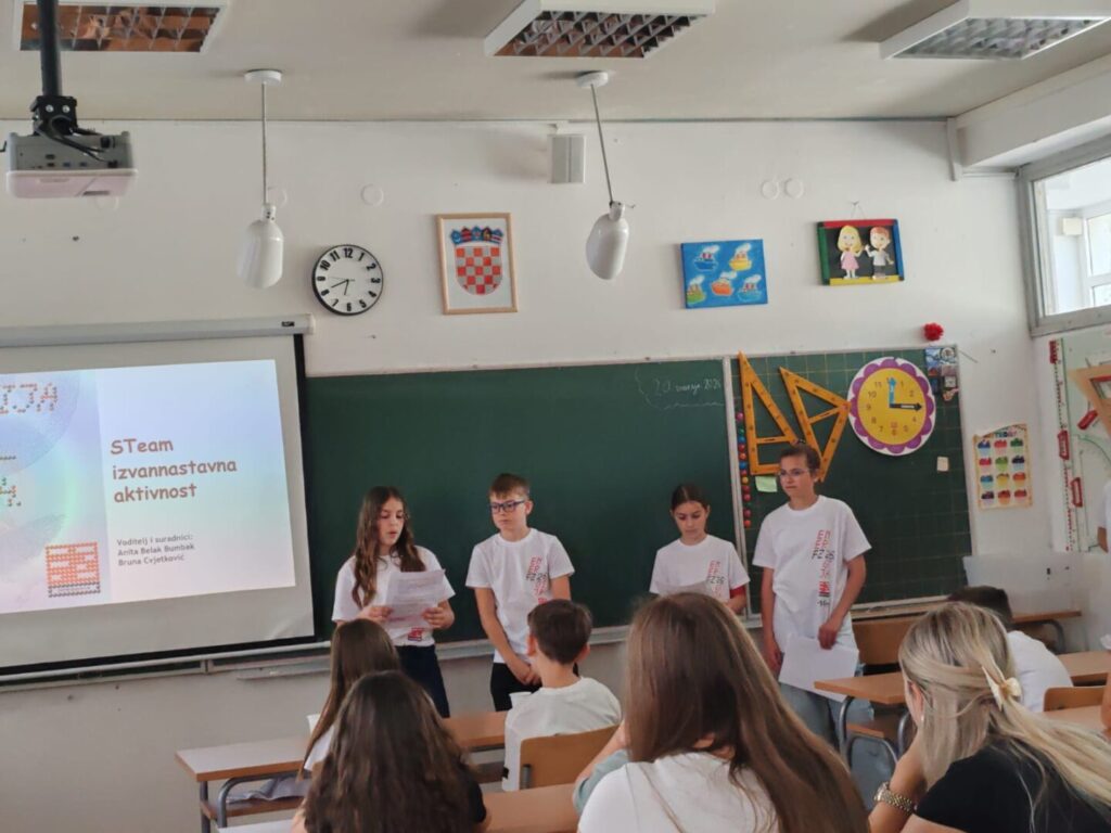 Središnji događaj u školi bila je prezentacija rada STeam grupe pod vodstvom Anite Belak Bumbak i Brune Cvjetković. Naš kreativni STeam predstavio je ovogodišnji projektni zadatak: “STEAM = PARA”.