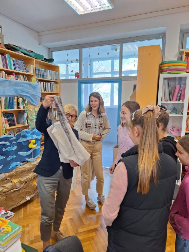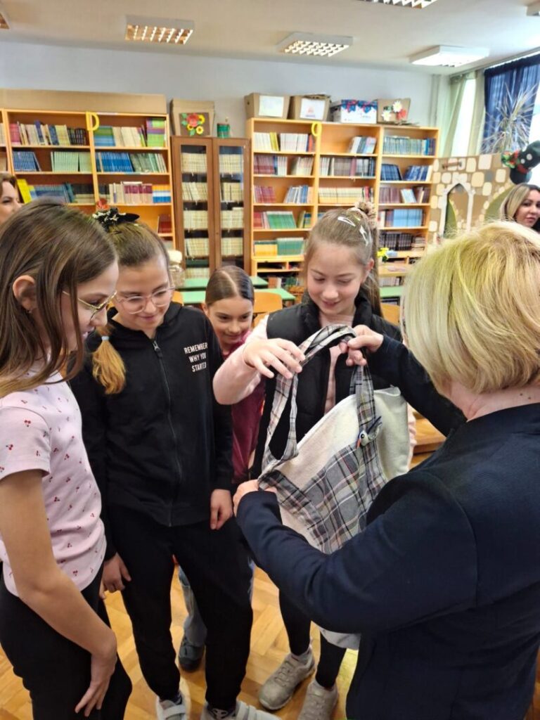 Nakon lijepog druženja, učenici su joj poklonili torbu koju su sami izradili u Kutku za šivanje (u knjižnici) i ukrasili uradak malim ručno sašivenim galebom. Predložili su našoj gošći da u njoj nosi knjige i uživa u čitanju i, naravno, pisanju te da torbu u budućnosti napuni svojim novim djelima.